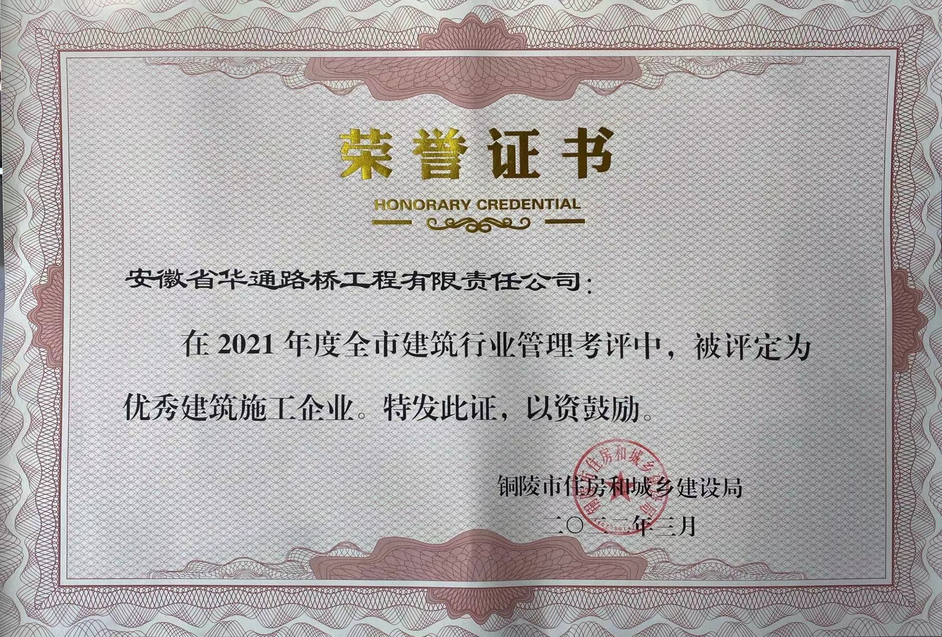 为加强我市建筑行业的管理,提高企业的经营管理水平,2021年底市住建局对全市建筑业企业进行全面考核。此次考核主要从企业严格遵循建管法律法规、维护建筑市场秩序、具有较为完善的质量、安全生产管理体系、重视技术开发和人才培养以及采用新工艺新技术等方面进行考核,企业的各项主要经济技术指标必须在全市或同行业处于领先地位。2021年度,公司为更好发挥资质硬件优势,积极做好配套软件要素,积极开展争优创先工作。荣获由交通运输部颁发的“安全生产标准化一级企业”证书、第八届建设行业金筑奖“全国优秀施工企业”荣誉称号以及“安徽省优秀建筑企业”荣誉称号。为将新工艺、新技术得到应用和推广,申请并获批5项实用新型专利。同时外省市场开发也取得质的突破,继广东、河北省后,相继中标宁夏、新疆、内蒙古、云南和海南等省、自治区,提高了企业信用度和知名度。